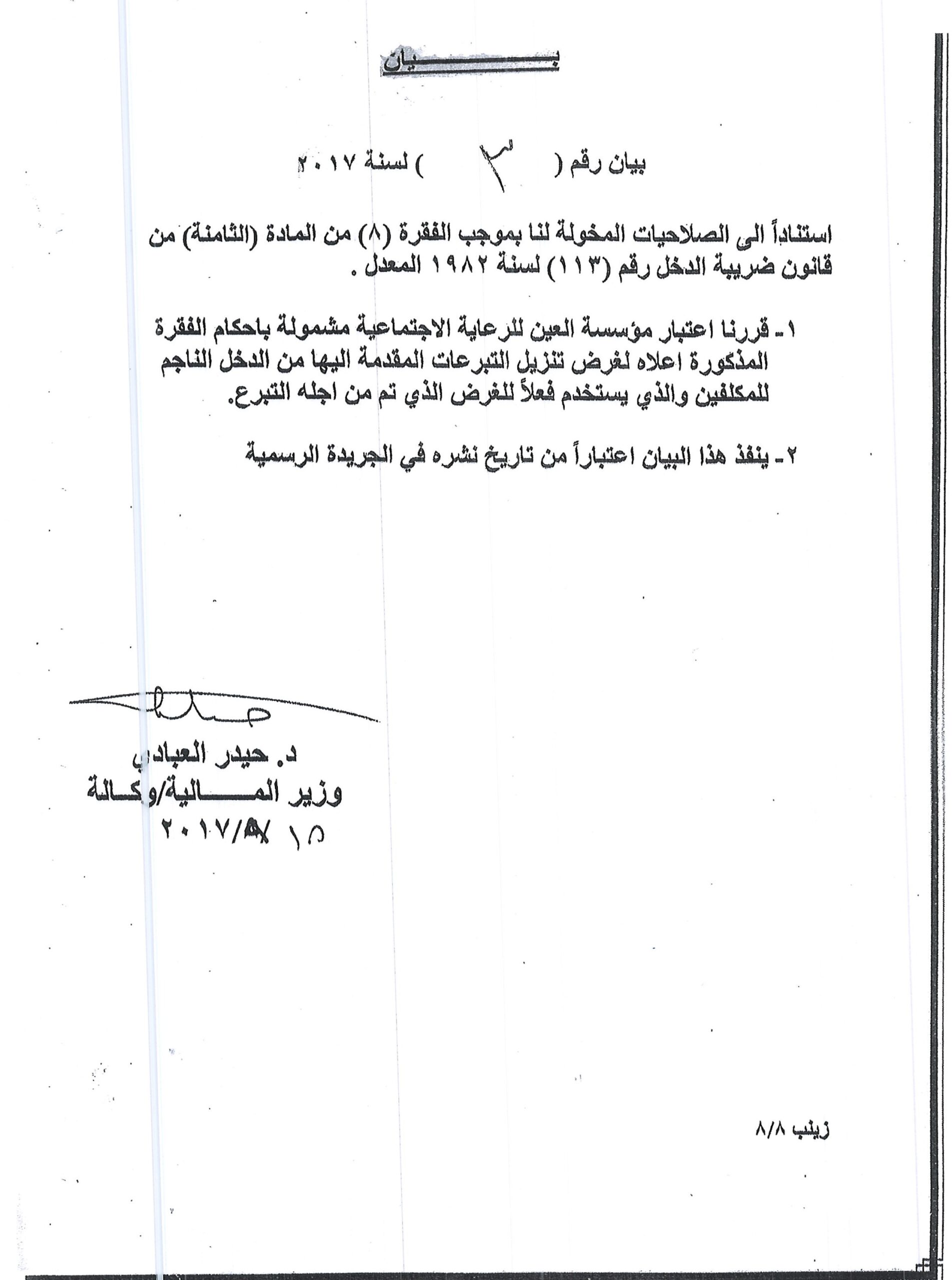 وقد حظينا في مؤسسة العين للرعاية الاجتماعية كذلك بامتياز قانوني آخر بعد اعتبار التبرعات المقدمة لعملنا تنزيلاً من الدخل الضريبي، وهذا ما لم يحصل في العراق منذ عام 1983. وجاء هذا الامتياز استناداً إلى موافقة وزير المالية على شمول مؤسسة العين للرعاية الاجتماعية بأحكام الفقرة (8) من المادة (الثامنة) من قانون ضريبة الدخل رقم (113) المعدل لسنة 1982، متضمناً تنزيل التبرعات المقدمة للمؤسسة من الدخل الخاضع للضريبة وفق البيان رقم (3) لسنة 2017 المنشور في جريدة الوقائع العراقية ذات العدد (4466) في 23 من تشرين الأول 2017م.
