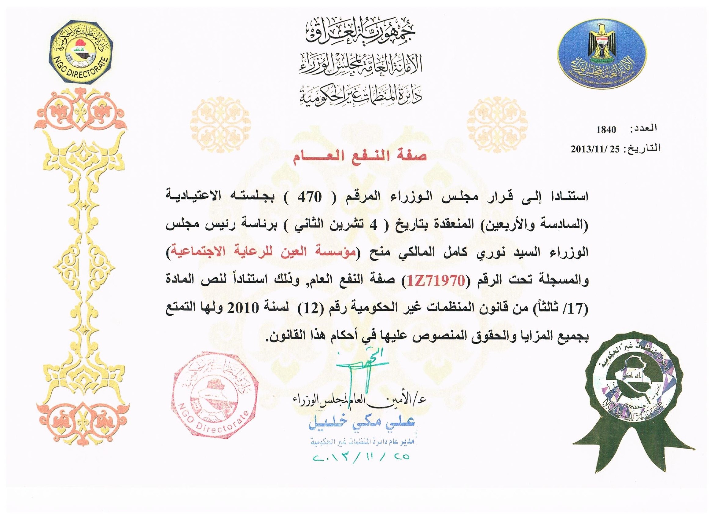جُدِّدَ التسجيل في وقت لاحق بعد صدور قانون المنظمات غير الحكومية رقم (12) لعام 2010 لدى دائرة المنظمات غير الحكومية التابعة للأمانة العامة لمجلس الوزراء بالشهادة ذات الرقم (1Z71970) في 15 من حزيران عام 2011 بصفة منظمة محلية. واكتسبنا بموجب ذلك الشخصية المعنوية لممارسة نشاطاتنا وفقاً لأحكام الدستور والقوانين العراقية النافذة. وحصلنا في الرابع من تشرين الثاني عام 2013 على صفة النفع العام استناداً إلى قرار مجلس الوزراء المرقم (470) وبموجب نص المادة 17/ ثالثاً من قانون المنظمات غير الحكومية رقم 12 لسنة 2010، وقد منحنا ذلك حق التمتع بجميع الامتيازات والحقوق المنصوص عليها في أحكام هذا القانون، ليترجم ذلك كلُّه دورَنا الفاعل في المجتمع ومصداقية عملنا وكفاءته.